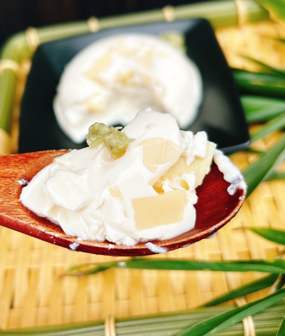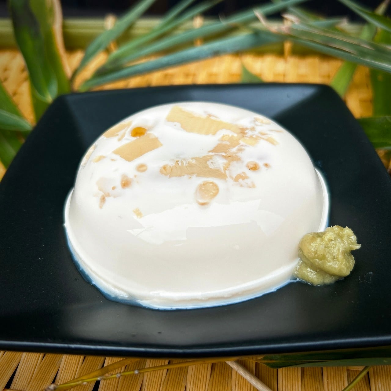 大豆のほのかな甘みとたけのこの風味や歯触りの良い食感が春の訪れを感じさせるお豆腐です。わさびや豆腐のおだしをつけてお召し上がりいただくとより一層甘みが引き立ちます。